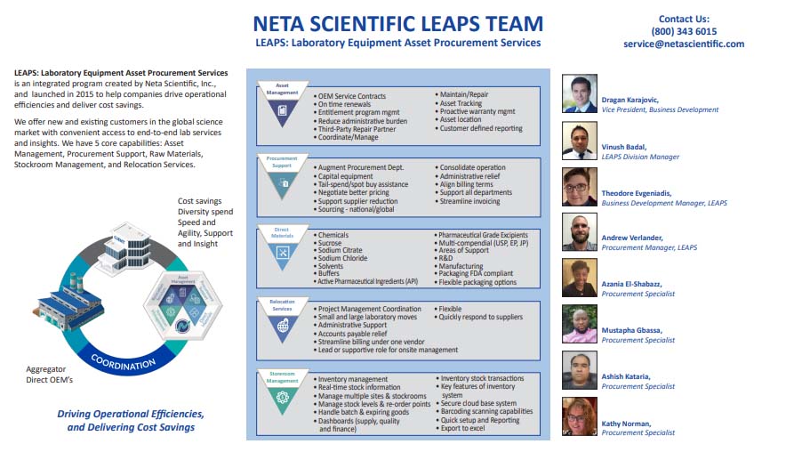 Our Laboratory Equipment Asset Procurement Services (LEAPS) division is a fully integrated business that provides new and existing customers within the life science industry with convenient access to end-to-end lab services and insights. The LEAPS division combines OEM contract administration, parts and relocation services and reporting with tier 1 diversity spend and cost savings, to ultimately drive operational efficiencies and economic outcomes nationwide.