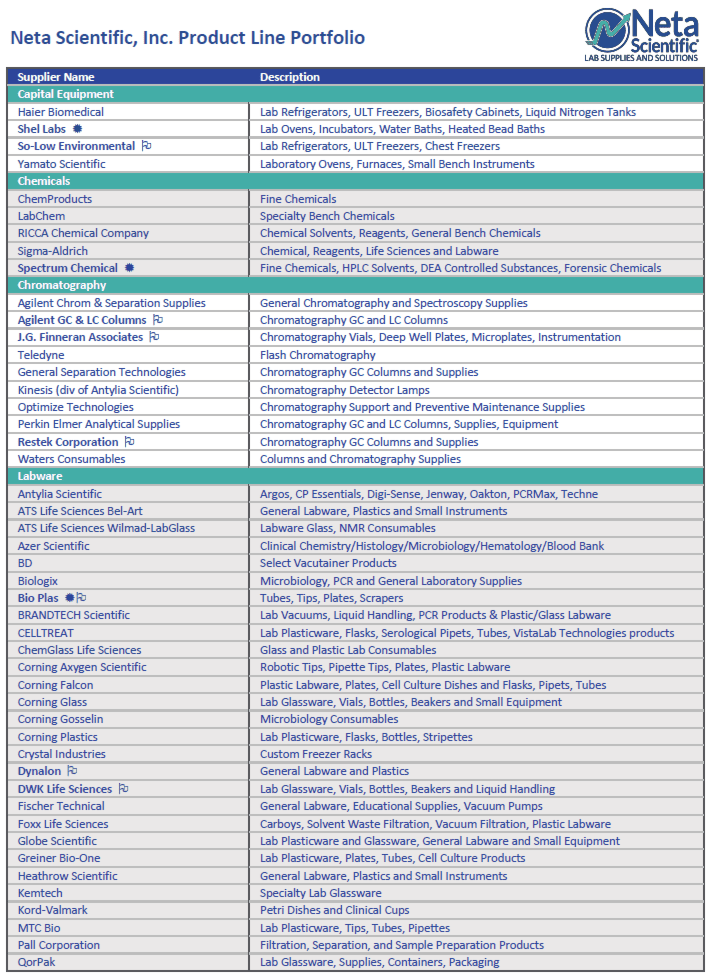 Neta Scientific, Inc. is a leading distributor of world-leading laboratory supplies and solutions, serving the pharmaceutical, biotechnology, and academic industries. We offer a robust catalog of leading brands like Agilent Technologies, Corning, Cytiva, IKA Works, and MilliporeSigma to more effectively conduct cutting-edge research and development.